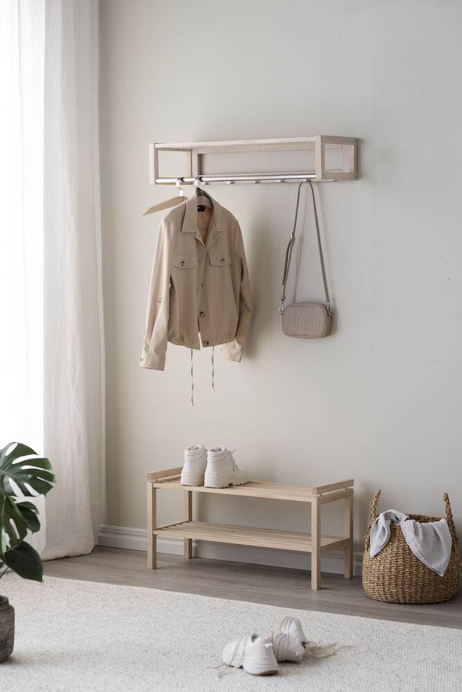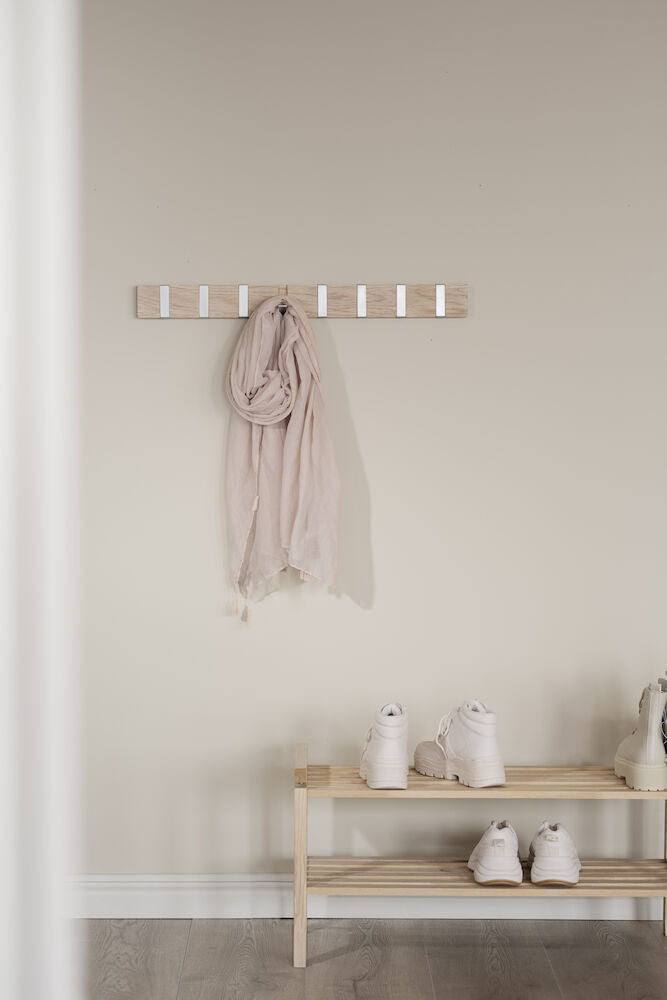 Confetti skohylla i massiv, vitpigmenterad ek. Stilren design med hyllor i två nivåer. Skohyllan ingår i hallserien Confetti.